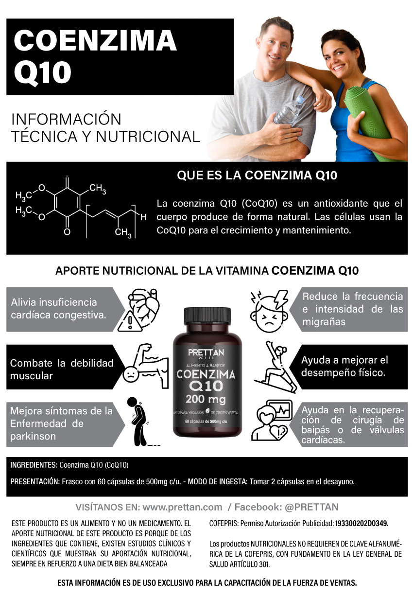 La coenzima Q10, también conocida como ubiquinona, ubidecarenona, coenzima Q, y abreviada a veces a CoQ10, CoQ, o Q10, es una 1,4-benzoquinona, donde la Q se re ere al grupo químico quinona y el 10 se re ere al número de subunidades del producto químico isoprenilo en su cola.
