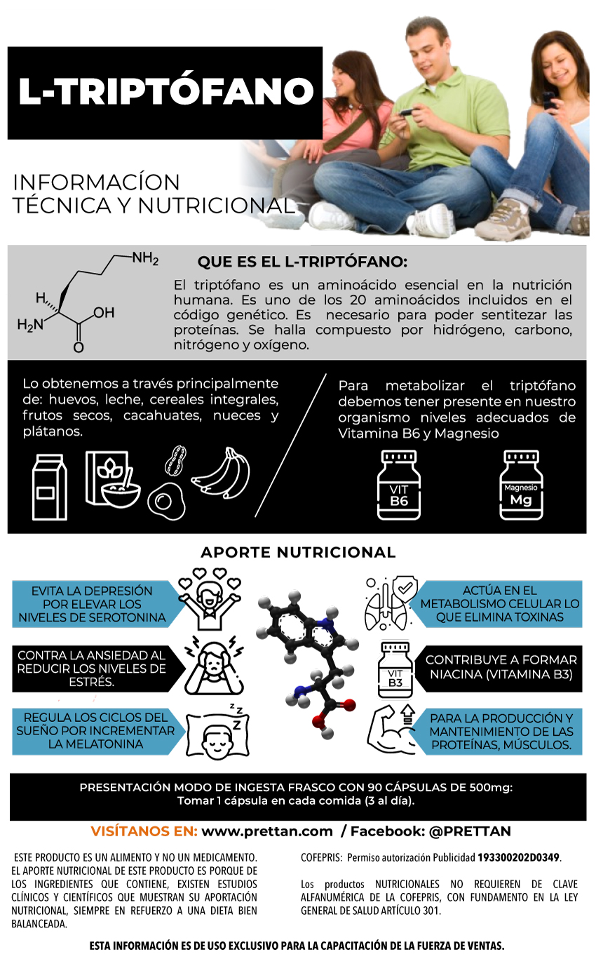 El triptófano es uno de los 8 aminoácidos esenciales de la dieta humana. Este es el precursor metabólico de la serotonina, melatonina y niacina.