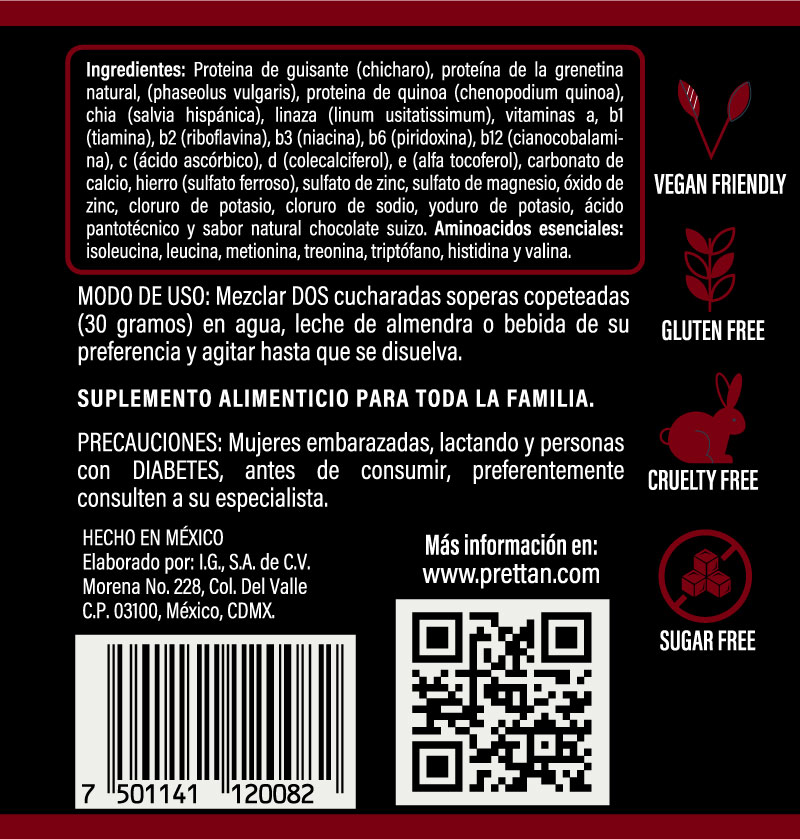 Proteína de Guisante (Chícharo), Proteína de la Grenetina Natural (Phaseolus Vulgaris), proteína de Quinoa (Chenopodium Quinoa), Chía (Salvia Hispánica), Linaza (Linum Usitatissimum), Vitaminas A, B1(Tiamina), B2 (Riboflavina), B3 (Niacina), B6 (Piridoxina), B12 (Cianocobalamina), C (Ácido Ascórbico), D (Colecalciferol), E (Alfa Tocoferol), Carbonato de Calcio, Hierro (Sulfato Ferroso), Sulfato de Zinc, Sulfato de Magnesio, Óxido de Zinc, Cloruro de Potasio, Cloruro de Sodio, Yoduro de Potasio, Ácido Pantoténico y Sabor Natural Frutos del Bosque. Aminoácidos Esenciales: Isoleucina, Leucina, Metionina, Treonina, Triptófano, Histidina Y Valina.