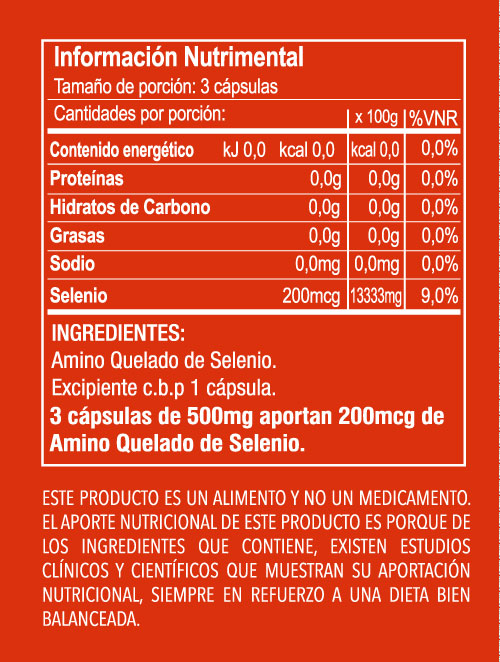 CONTRIBUYE A LA SALUD Y PROLONGACIÓN DE LA VIDA DE LAS CELULAS, PODEROSO ANTIOXIDANTE. APOYA AL DESARROLLO DEL SISTEMA INMUNOLÓGICO. TRES CÁPSULAS CONTIENEN 200 mcg. de SELENIO PURO.